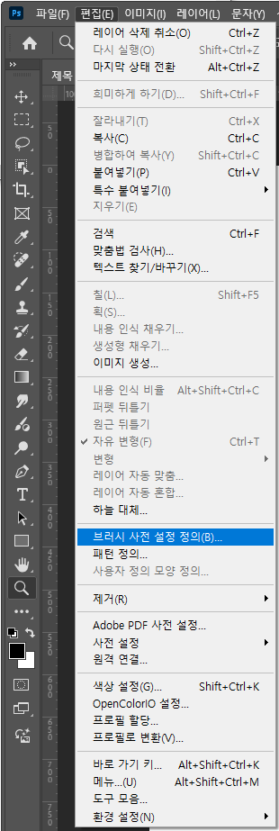 상단 옵션카테고리에 [편집-브러시 사전 설정 정의]를 클릭해줍니다.